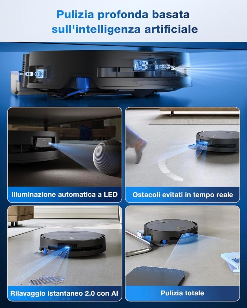 L’intelligenza artificiale integrata apprende costantemente le caratteristiche dell’abitazione, ottimizzando progressivamente i percorsi e i metodi di pulizia. Gli aggiornamenti OTA (Over-The-Air) garantiscono l’introduzione continua di nuove funzionalità e miglioramenti alle prestazioni.